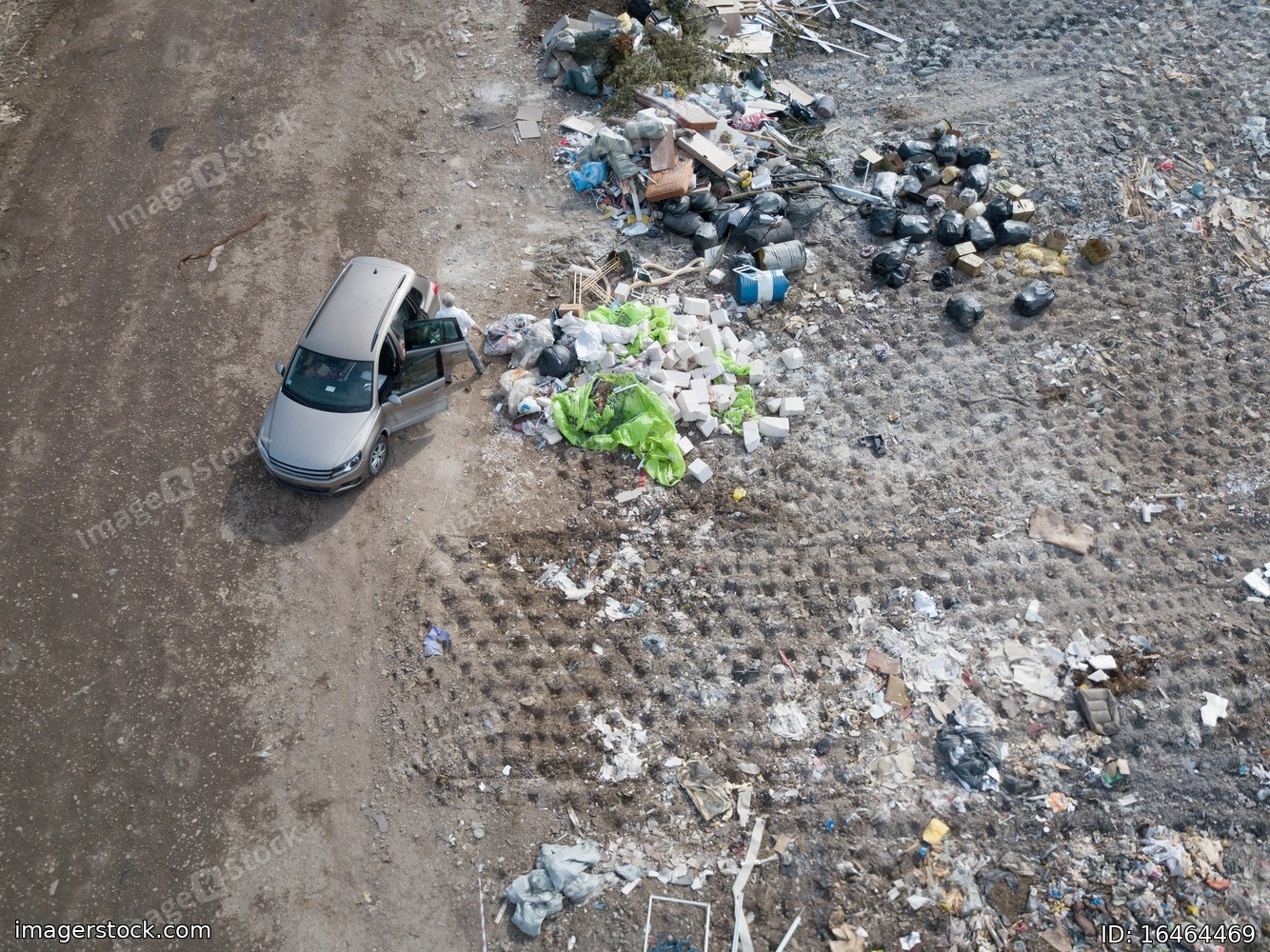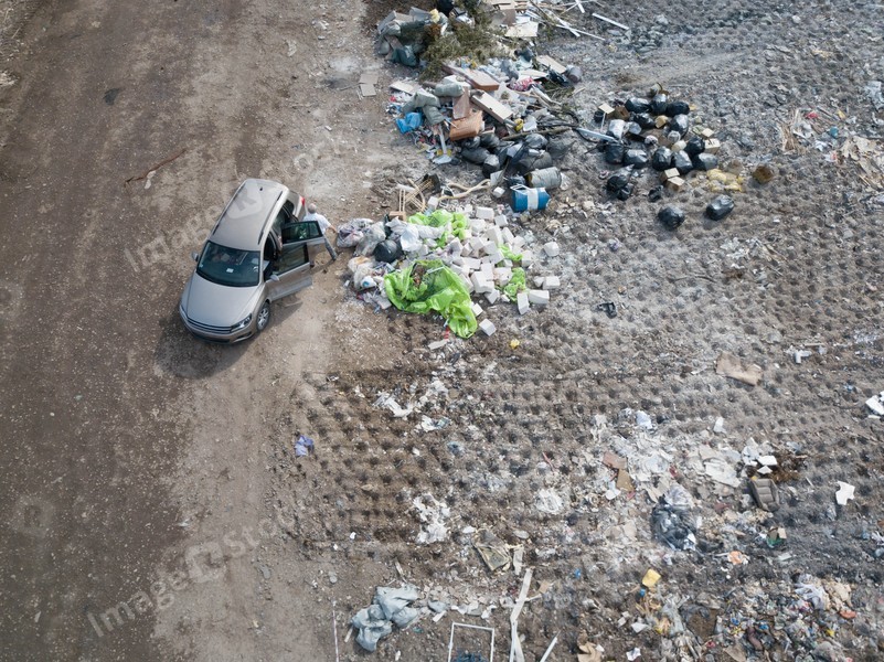 Top drone view of dump. Man near car on dirt road. Landfill of big city.
