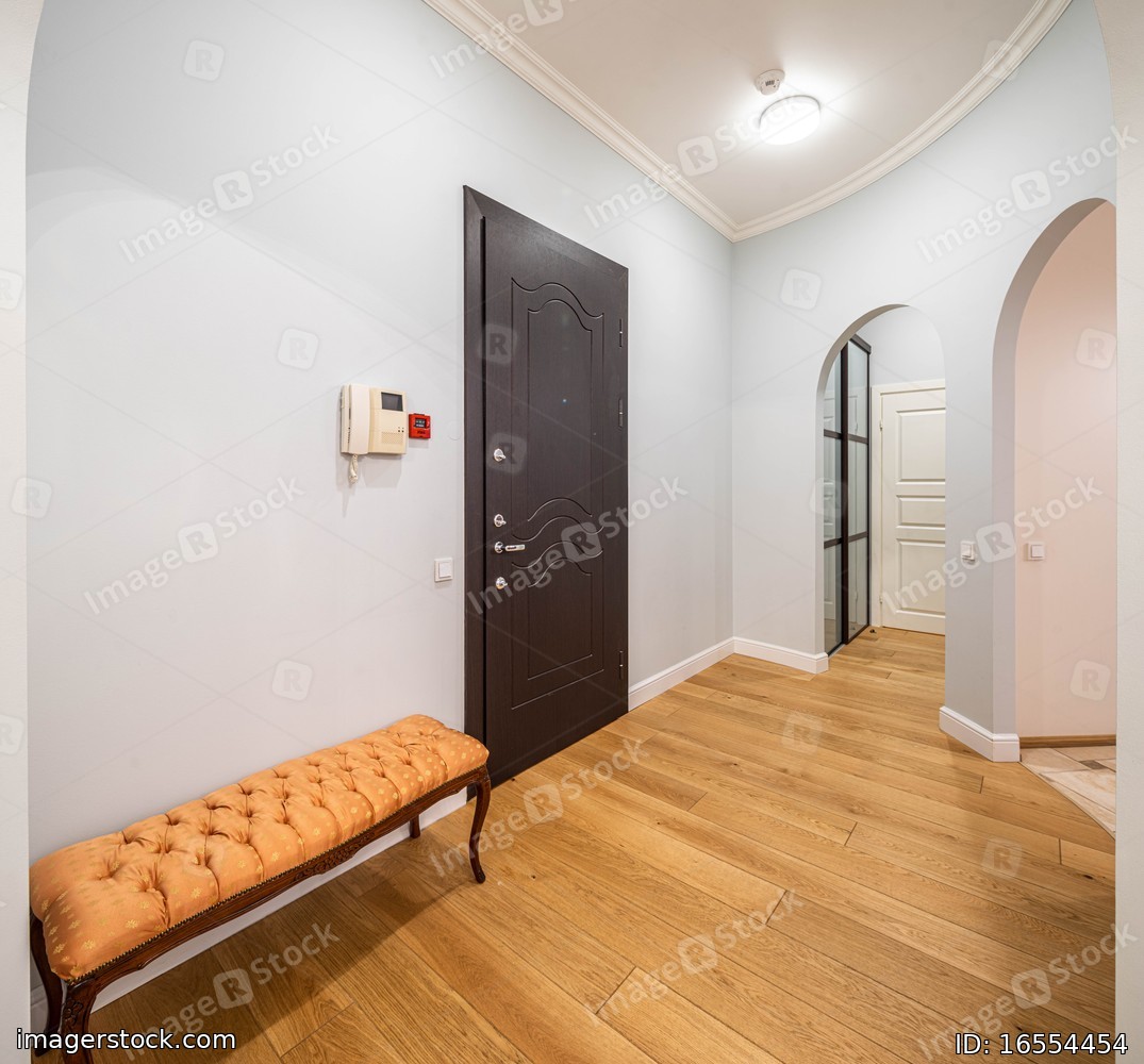 Entrance hall in modern apartment. Interior in light tones. Archs.