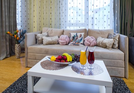 Romantic compositiom with drinks and fruits on the table. Cozy sofa.