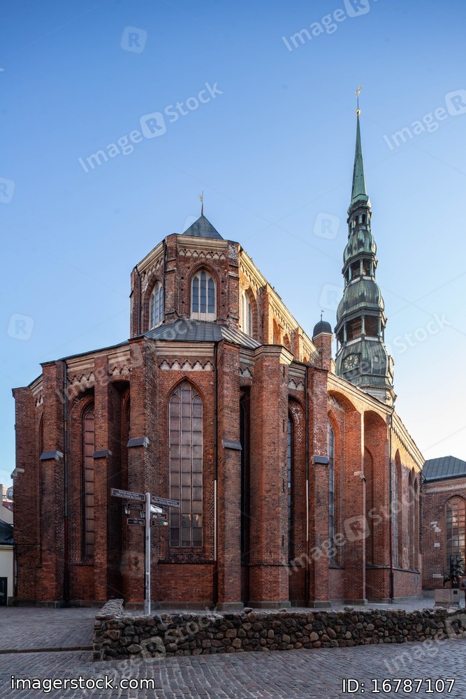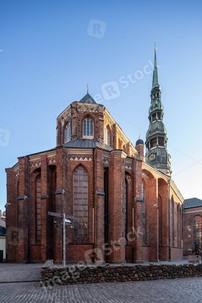St. Peter's Church, a Lutheran church in Riga, the capital of Latvia. Blue sky.