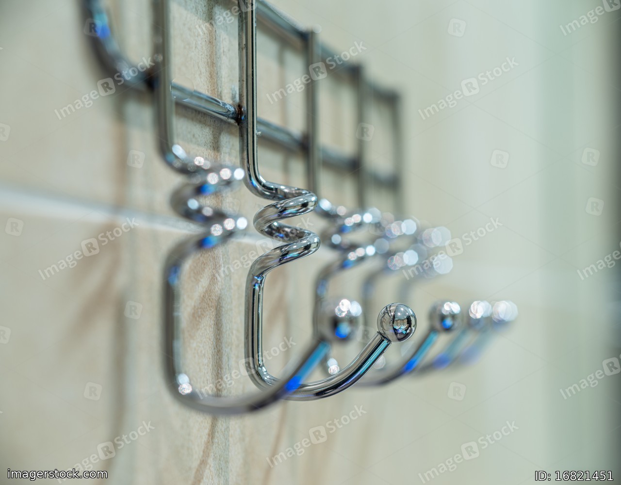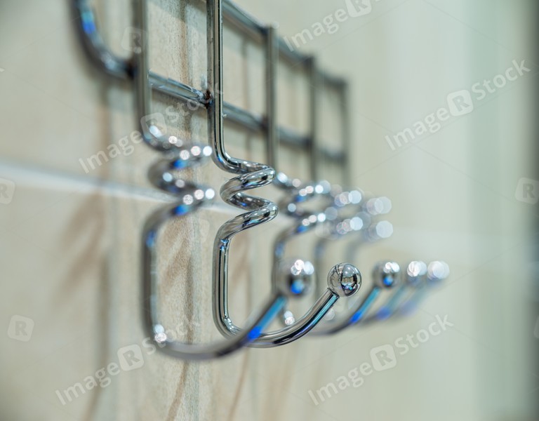 Metal hanger with many hooks for towels and clothes. Close-up.