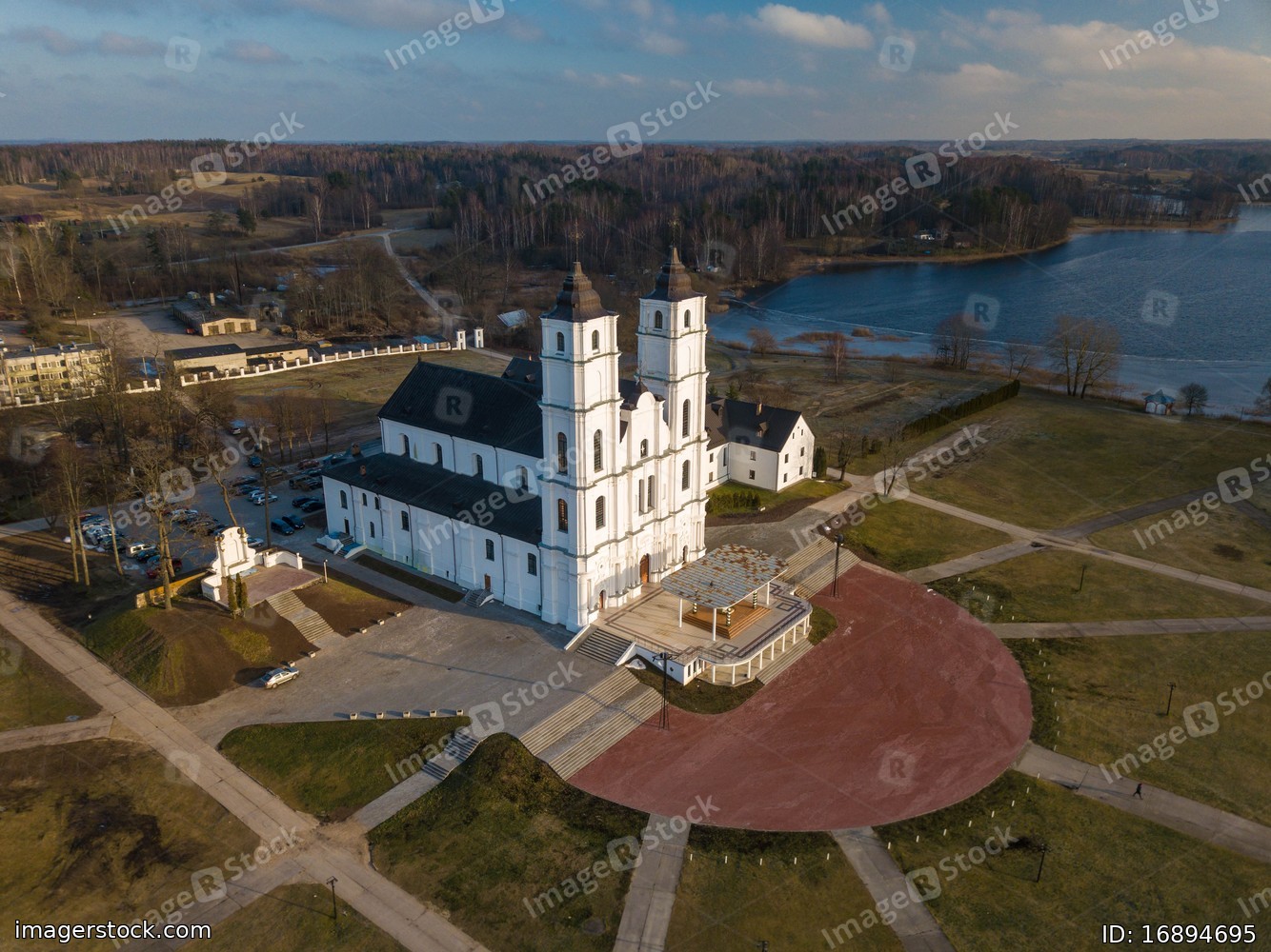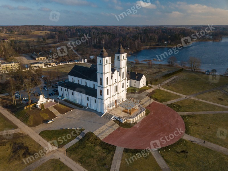 Top drone view of Aglona Roman Catholic Basilica of the Assumption of the Blessed Virgin Mary in Latvia. Forest and lake.