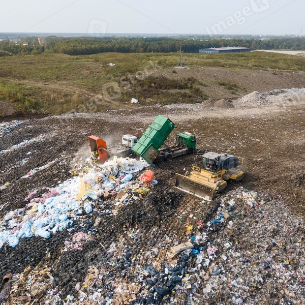Top drone view of dump with different types of garbage. Trucks unloading waste on landfill. Yellow tractor. Waste sorting.