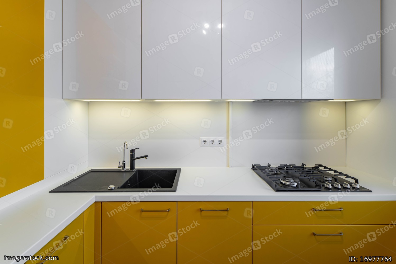 Close-up of black sink and gas stove built-in white counter. Modern interior of kitchen. Stylish yellow kitchen set.