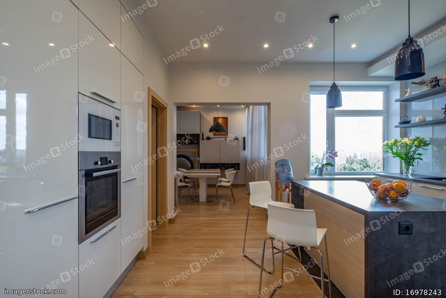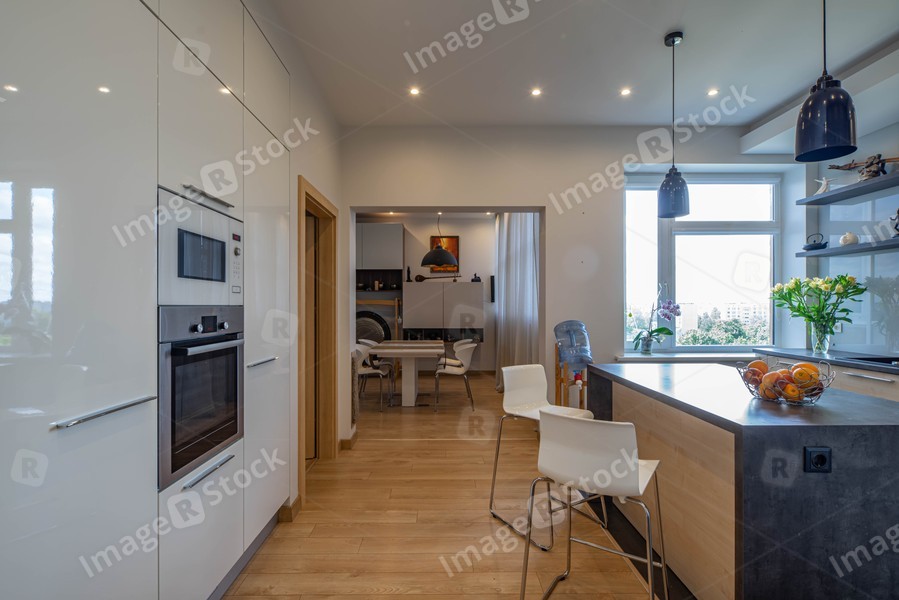 Contemporary interior of kitchen in luxury studio flat. Wooden kitchen table with dark counter. Living room. Built-in kitchen set with oven.