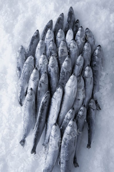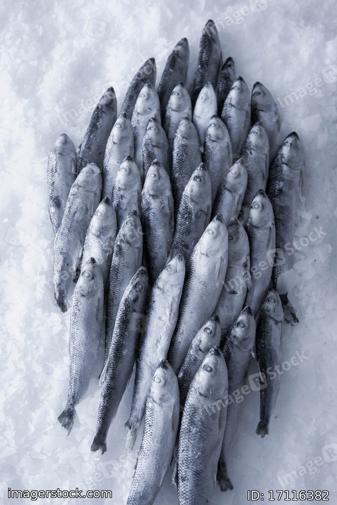 Close-up of fresh sprat on the ice in fish market. Winter fishing. Small silver fish.