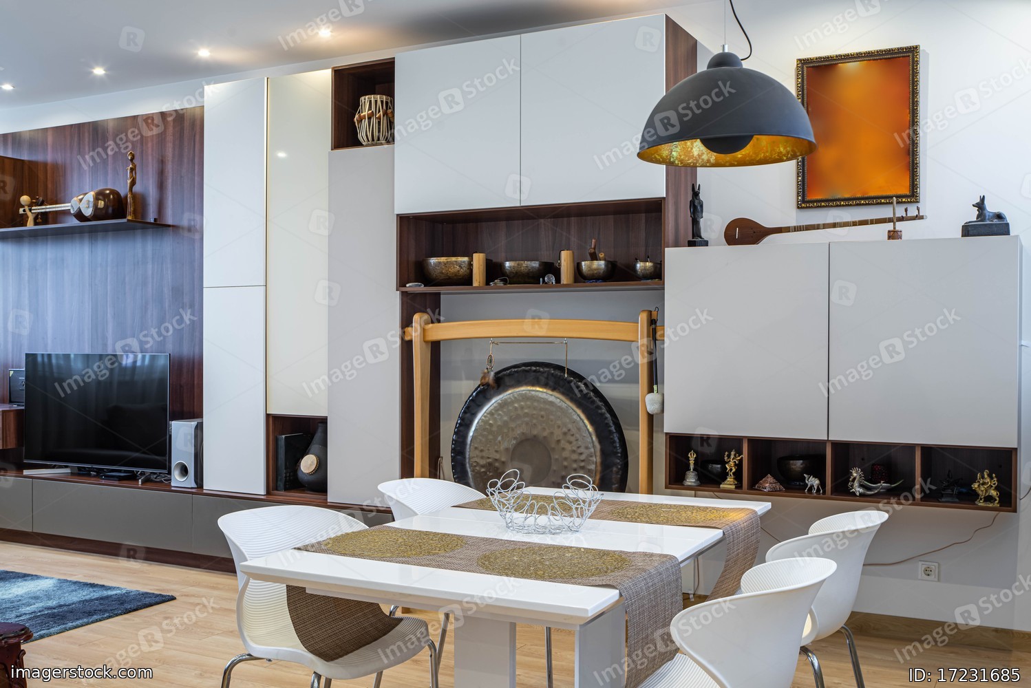 Luxury interior of living room in apartment. Chairs and table. Stylish white wall unit with Tibetian bowls and decorative gong.