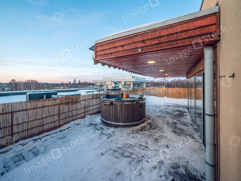 Open terrace with hot outdoor wooden bath tub. Luxury private house.