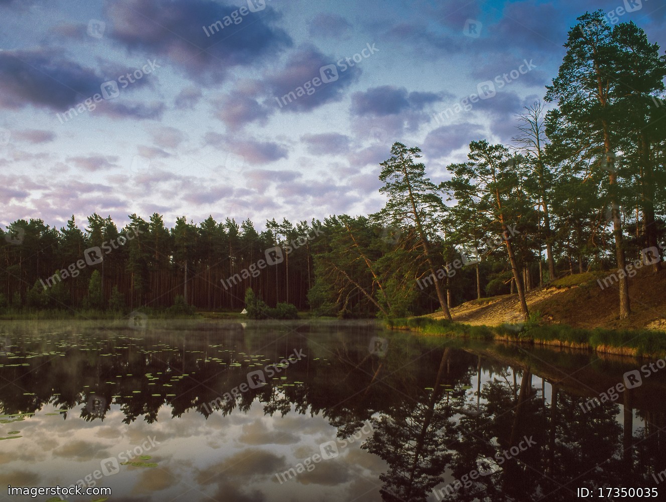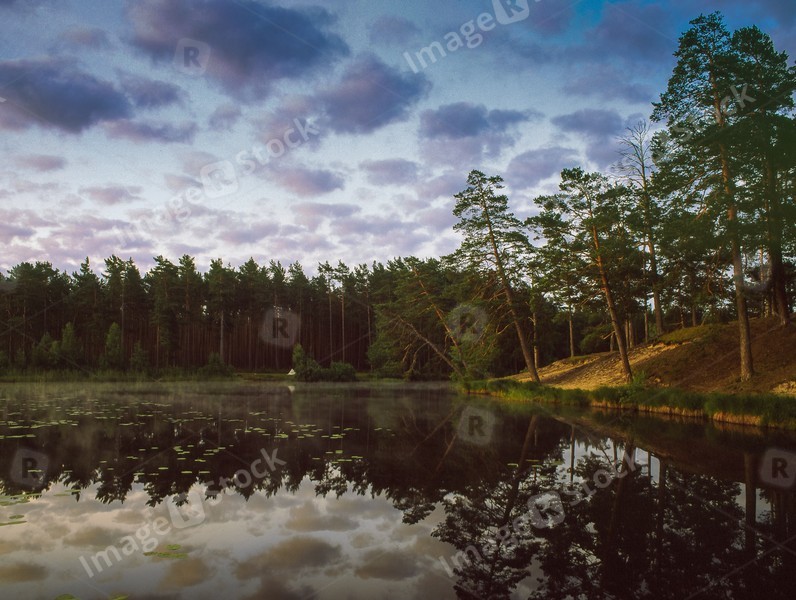 A lake in a pine forest. Beautiful clouds.
