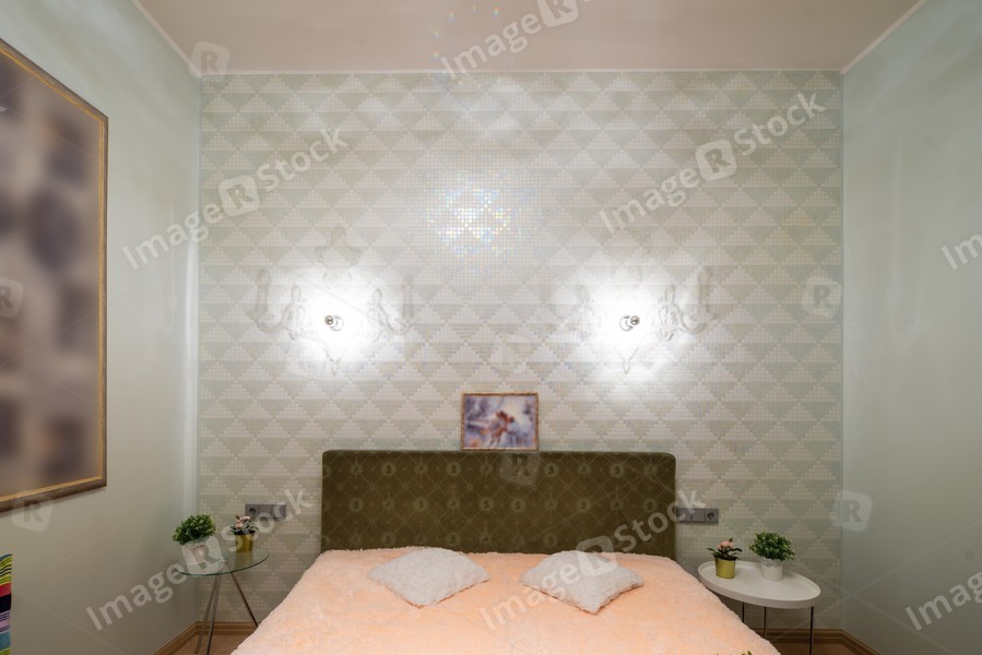 Modern interior of bedroom in studio apartment. King-size bed.