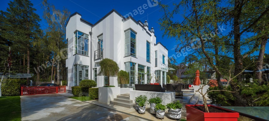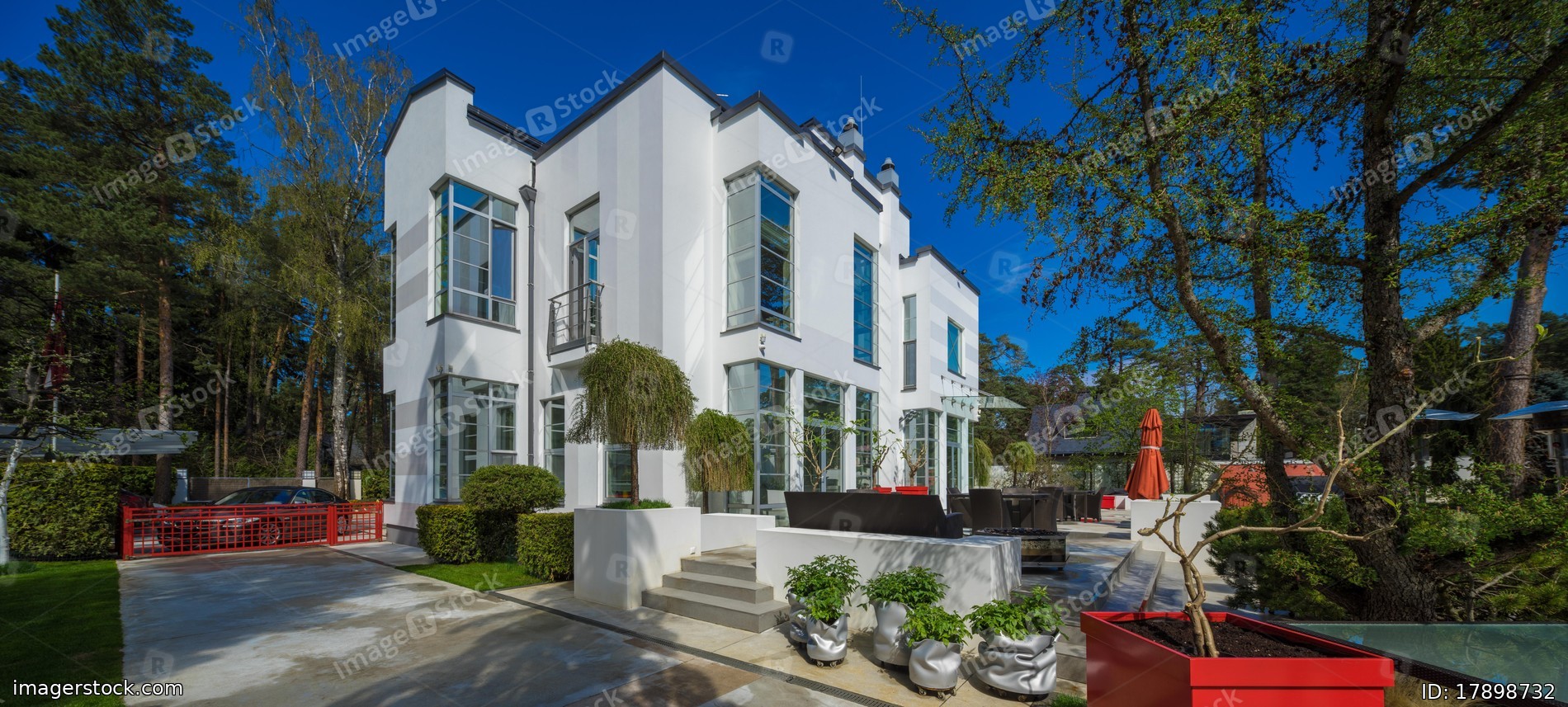 Modern exterior of luxury private house. Facade. Sunny summer day.