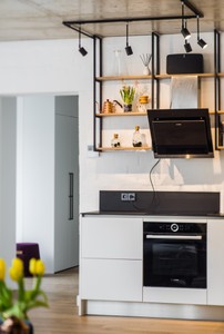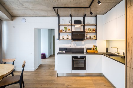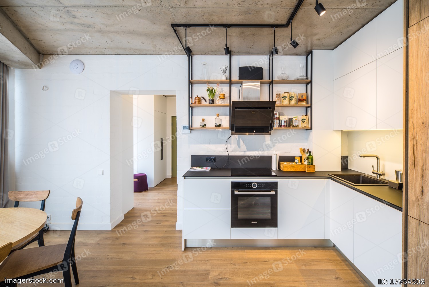 Interior of studio apartment, kitchen. Concrete ceiling. Loft.