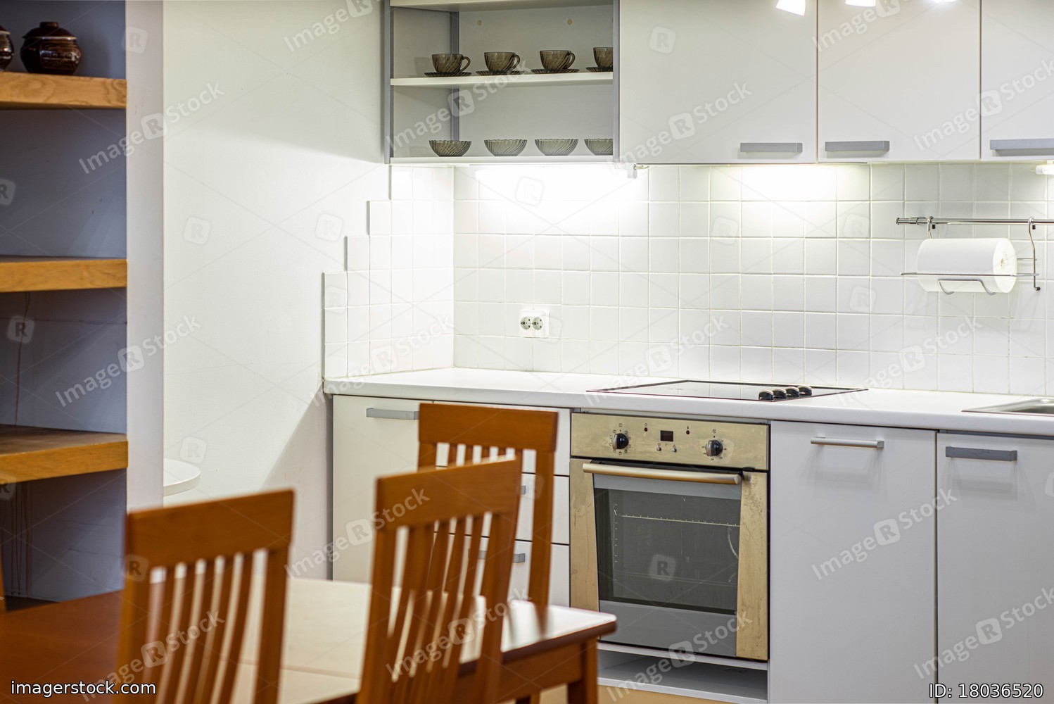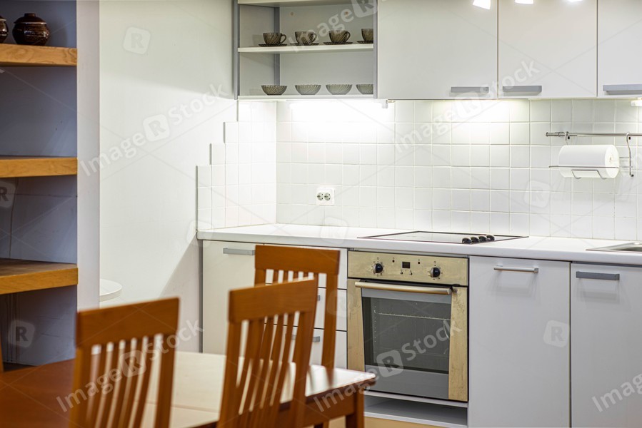 Kitchen in studio apartment. White interior. Wooden table and chairs. White kitchen set.