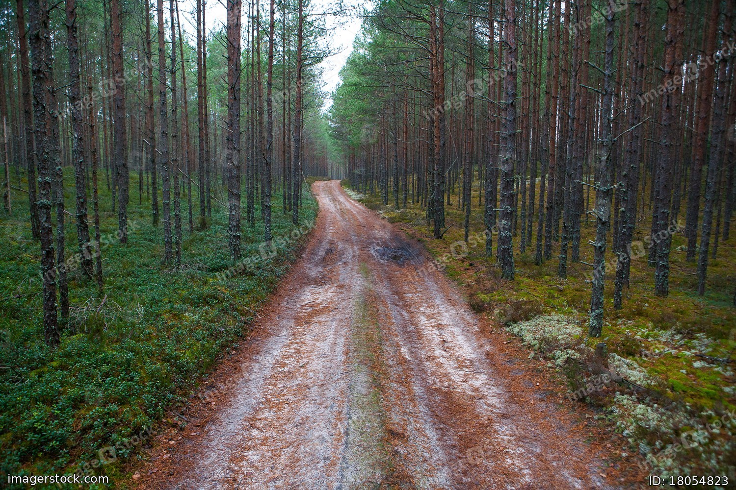 The road is in a pine forest. Summer time.