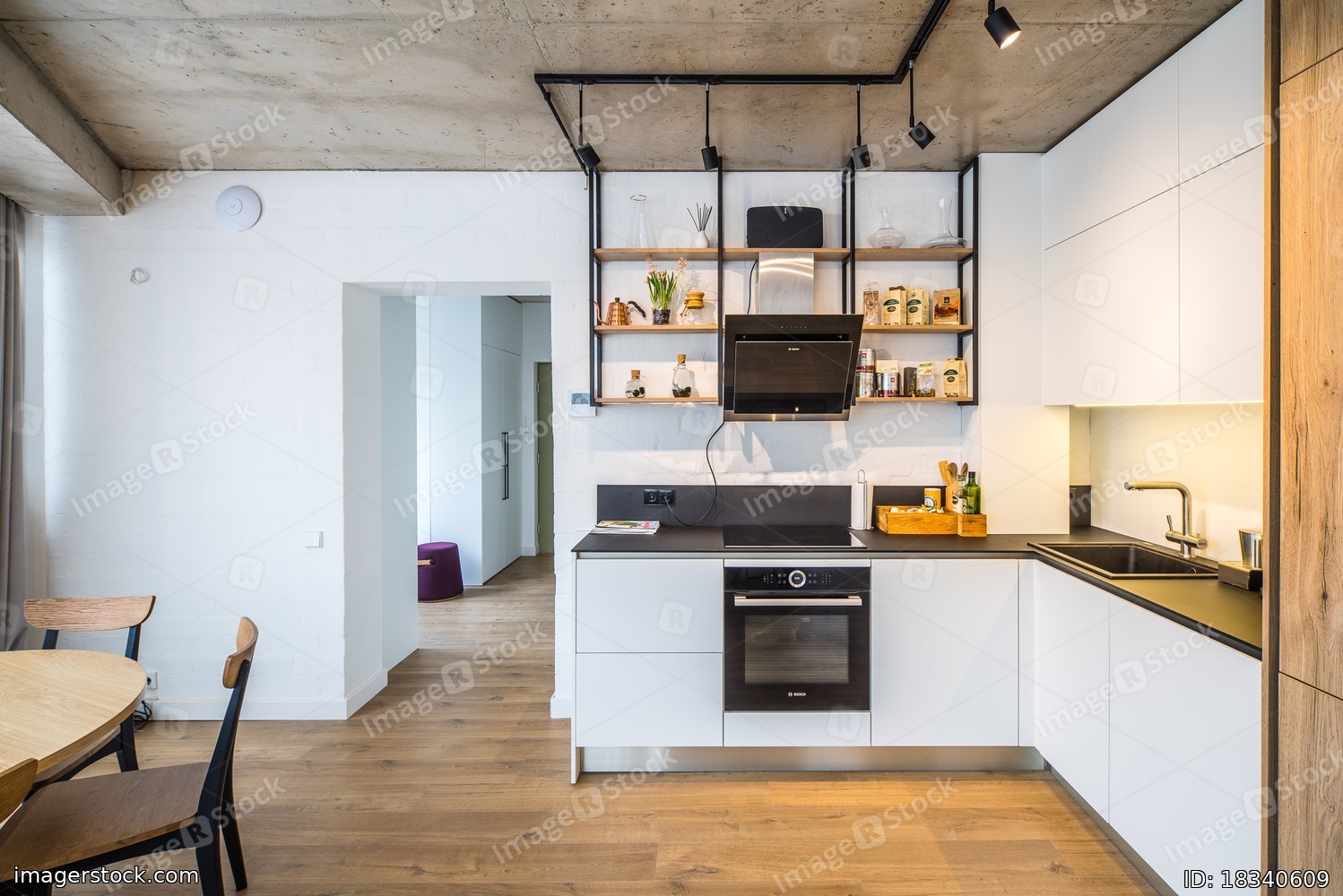 Interior of studio apartment, kitchen. Concrete ceiling. Loft.