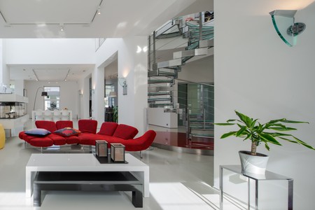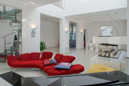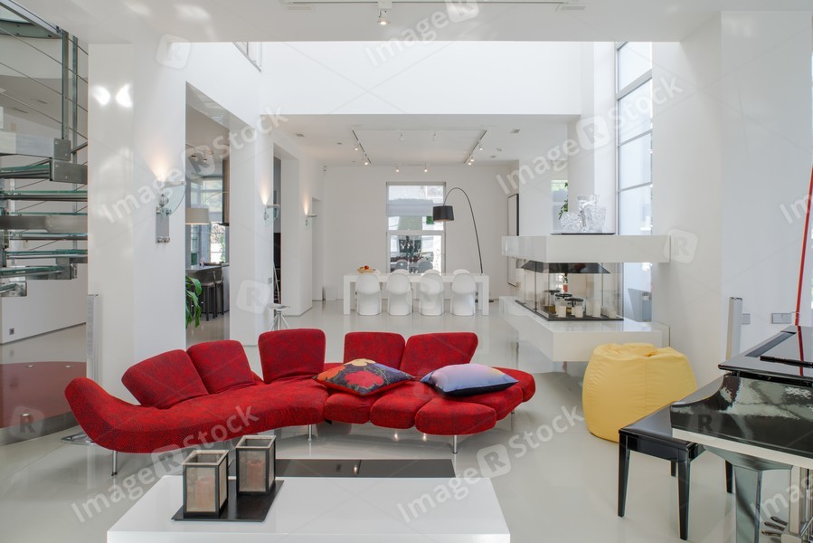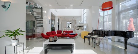 Modern interior. Luxury private house. Living room. Red sofa, piano