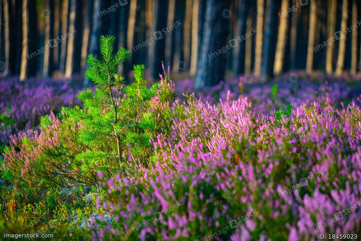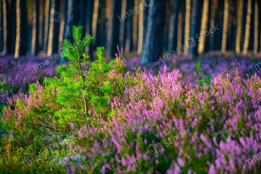 Sunny day. Blooming heather. Beautiful lawn in the forest.