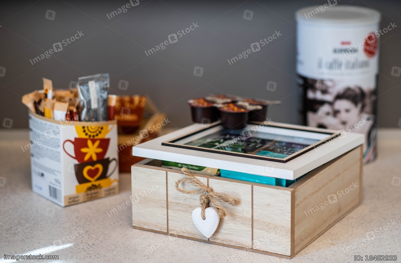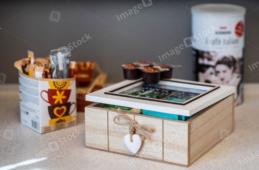 Close up of wooden box with tea. Blur coffee, sugar and cream.