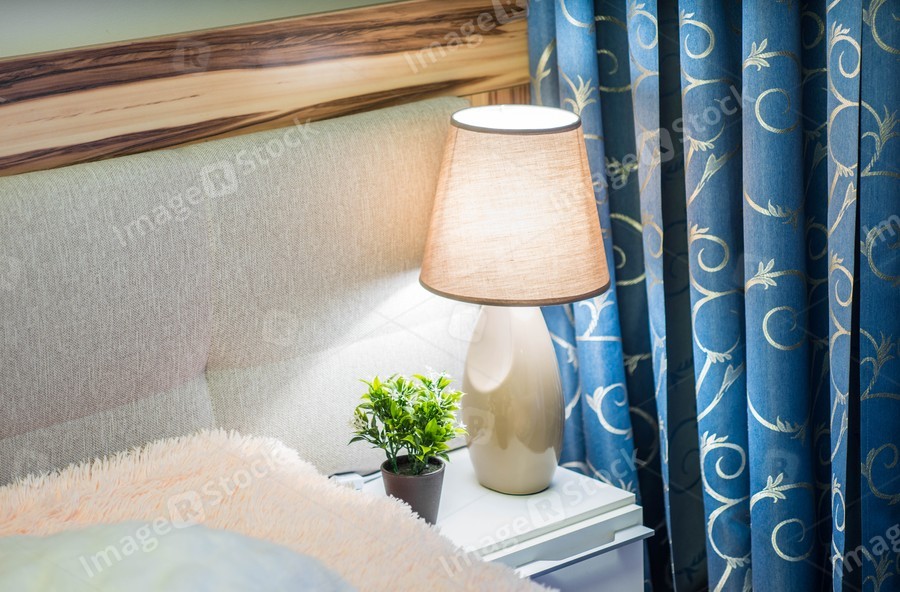 Composition with birning lamp on bedside in bedroom.