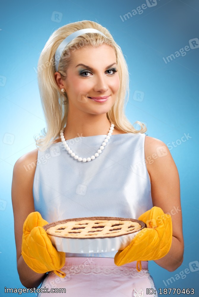 Beautiful woman holding hot italian pie. Retro stylized portrait