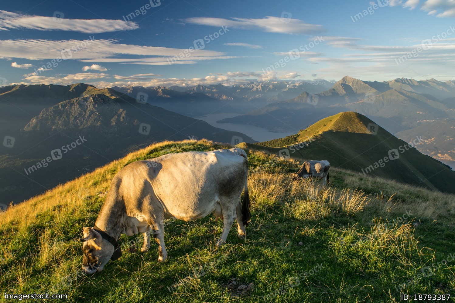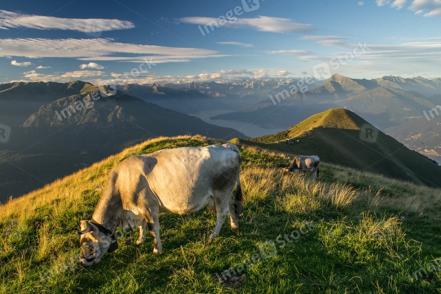 The pasture in the mountains. Cows grazing on the hills. Italy.
