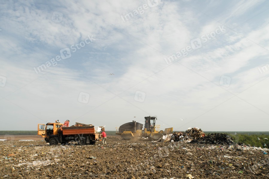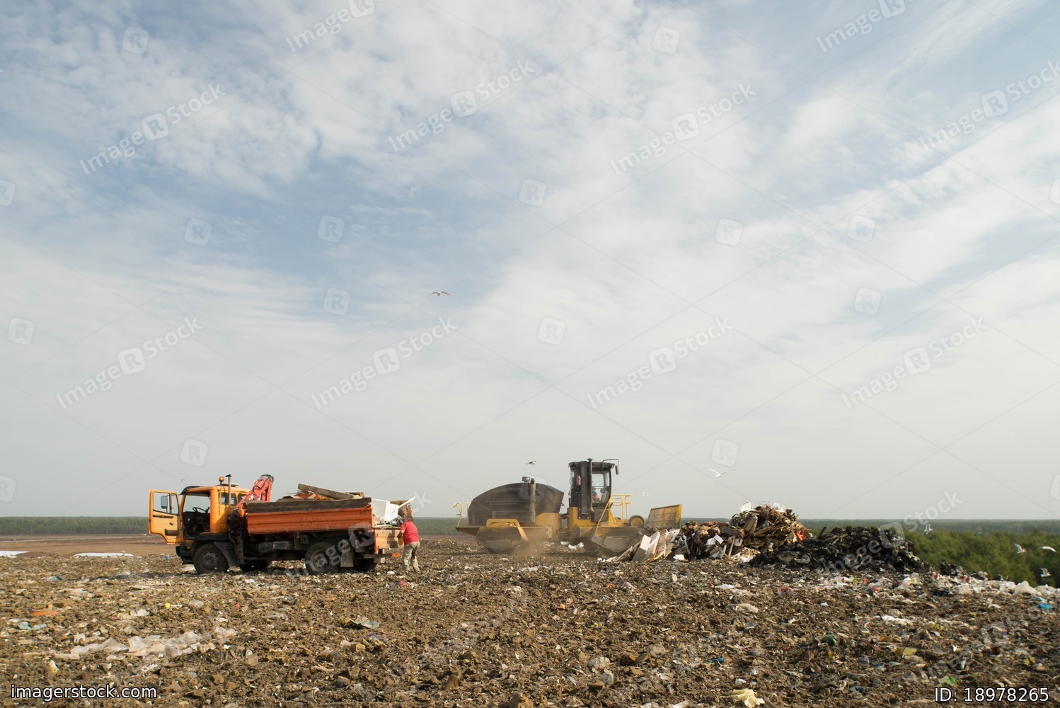 Huge dump of big city. Waste sorting on landfill. Truck and tractor. Preparing for recycling.