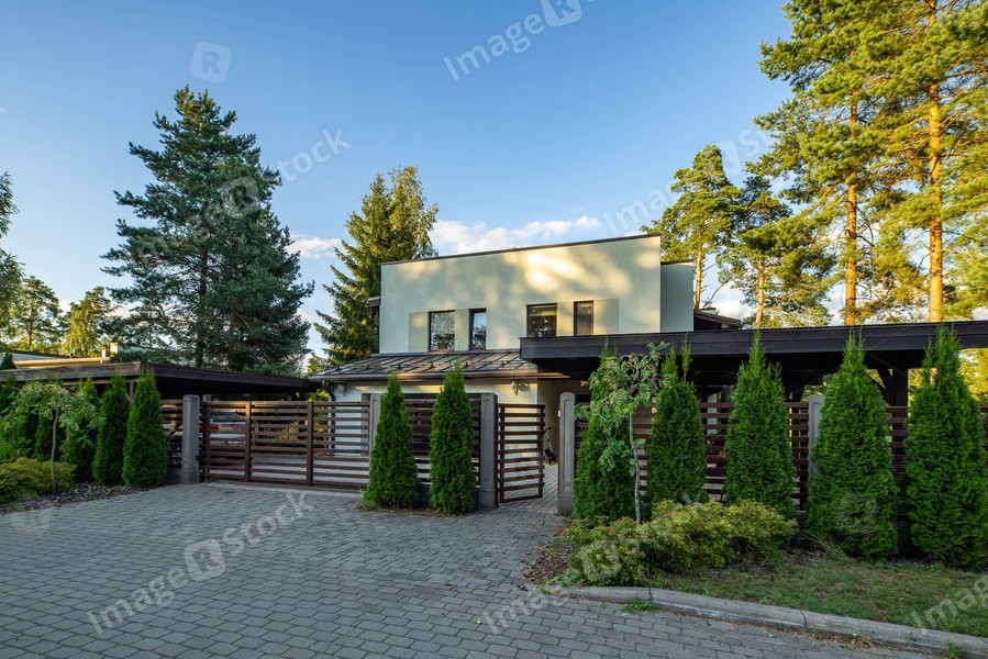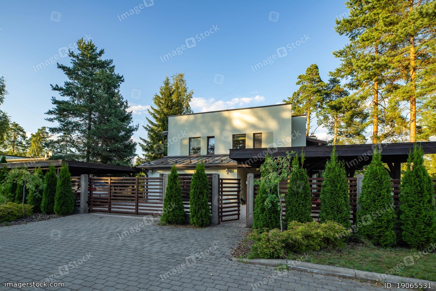 Exterior of luxury private house at sunny summer day. Green pines. Thujas at modern fence.