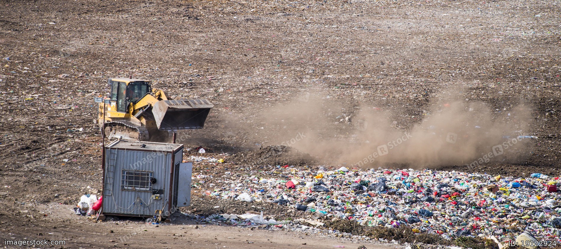 Huge dump of big city near forest. Tractor unloading waste. Preparation of garbage for recycling. Caring for environment.