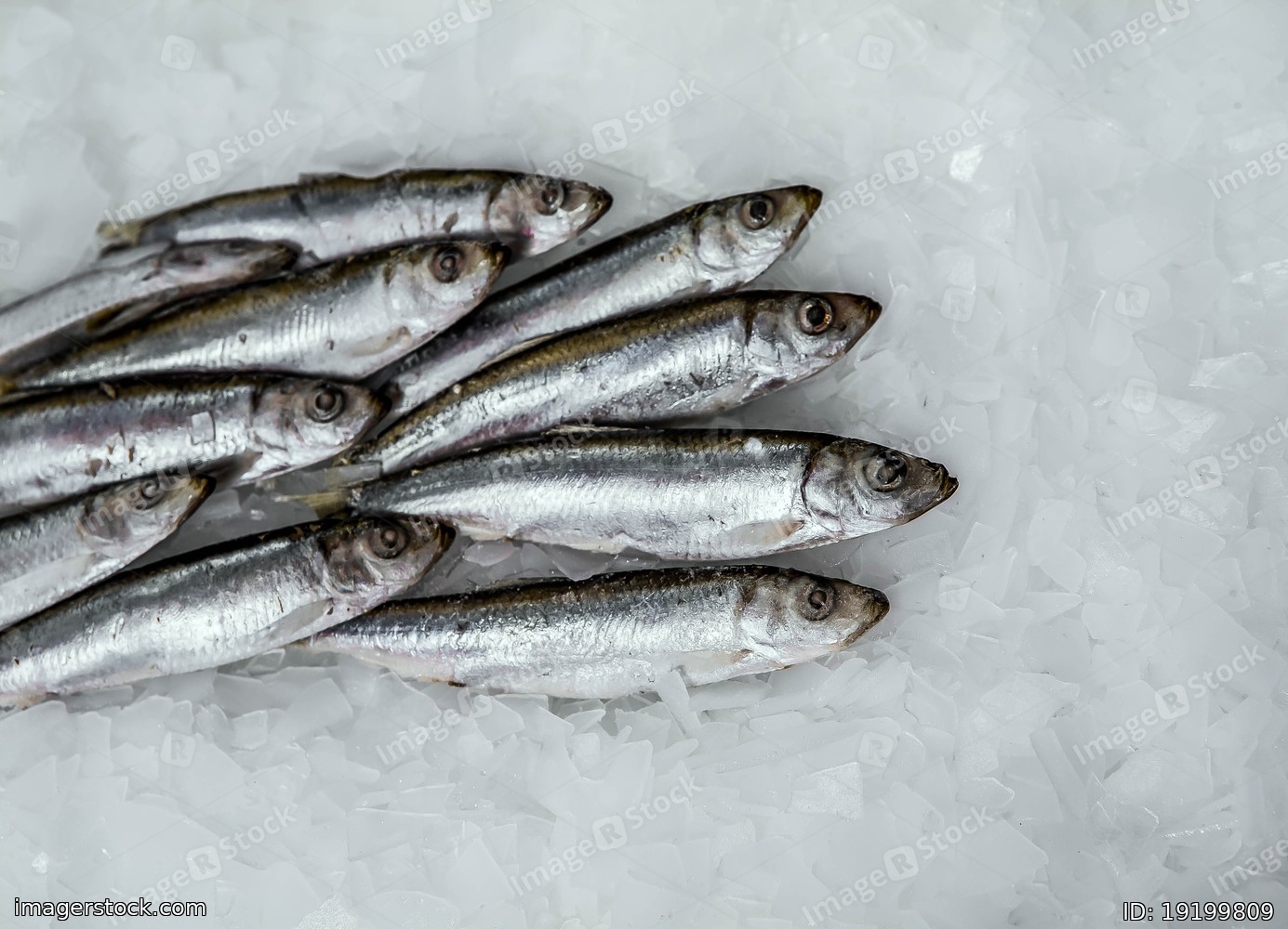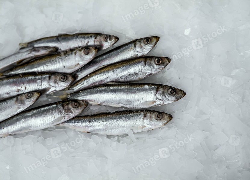Frozen fish. Small silver sprat in the market. Pieces of ice. Close-up. Winter fishing.