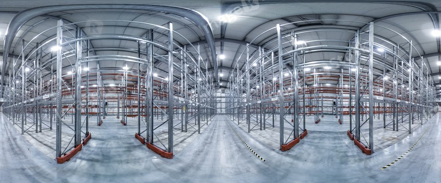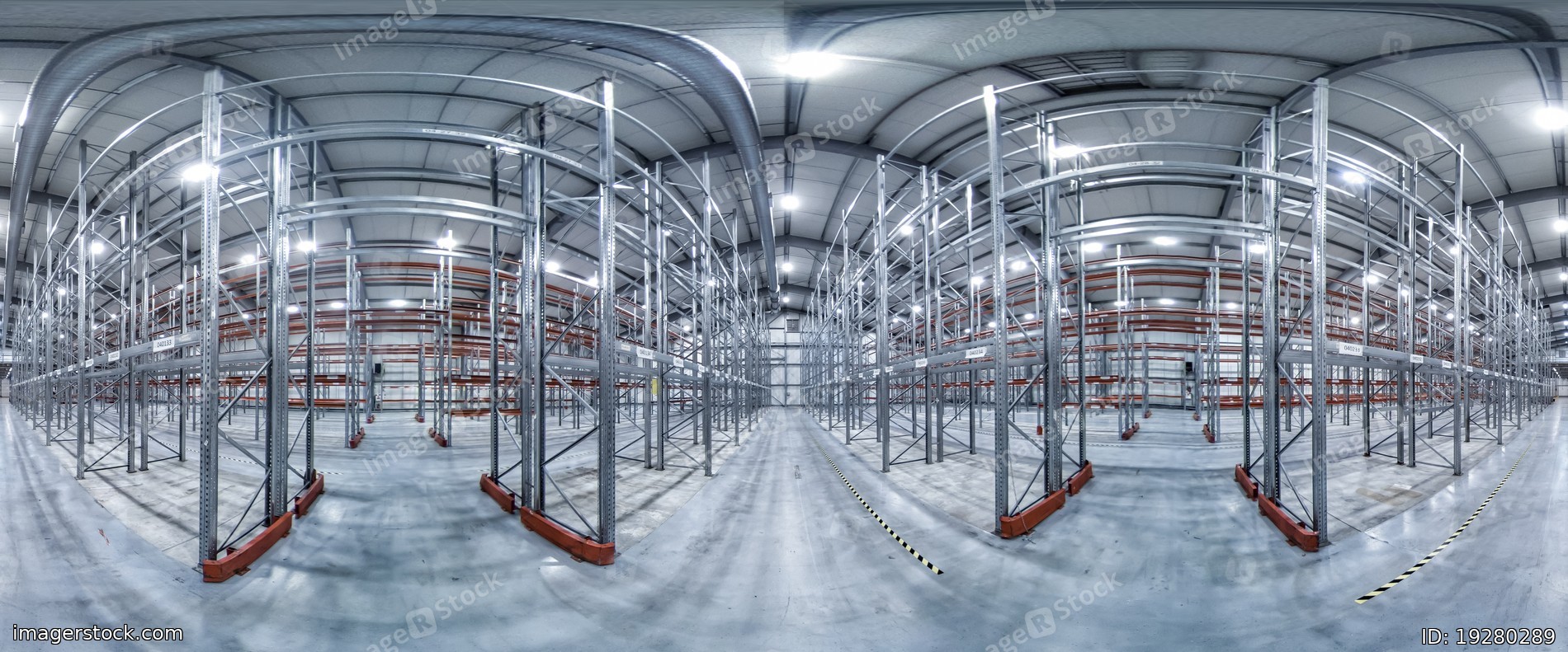 Spherical panorama 360 of empty industrial warehouse with metal rack.