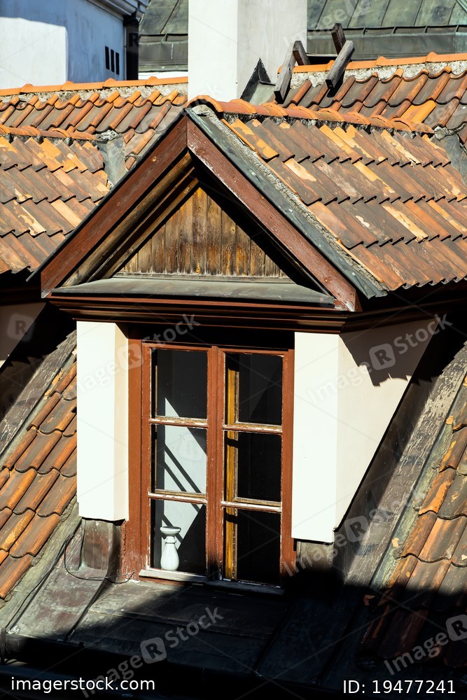Attic window on the roof of red roof tiles. Riga, Latvia.