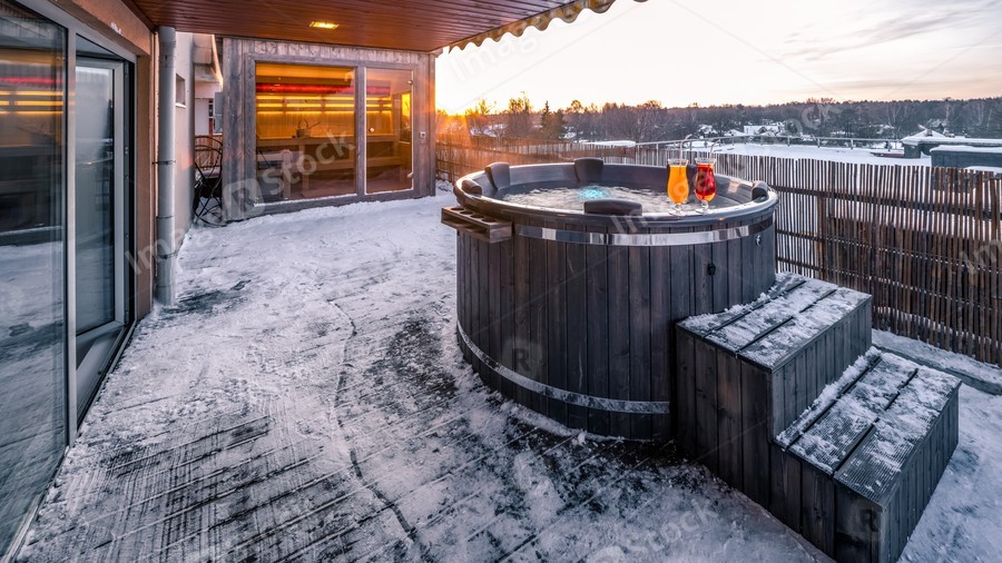 Open terrace with hot outdoor wooden bath tub. Luxury private house.