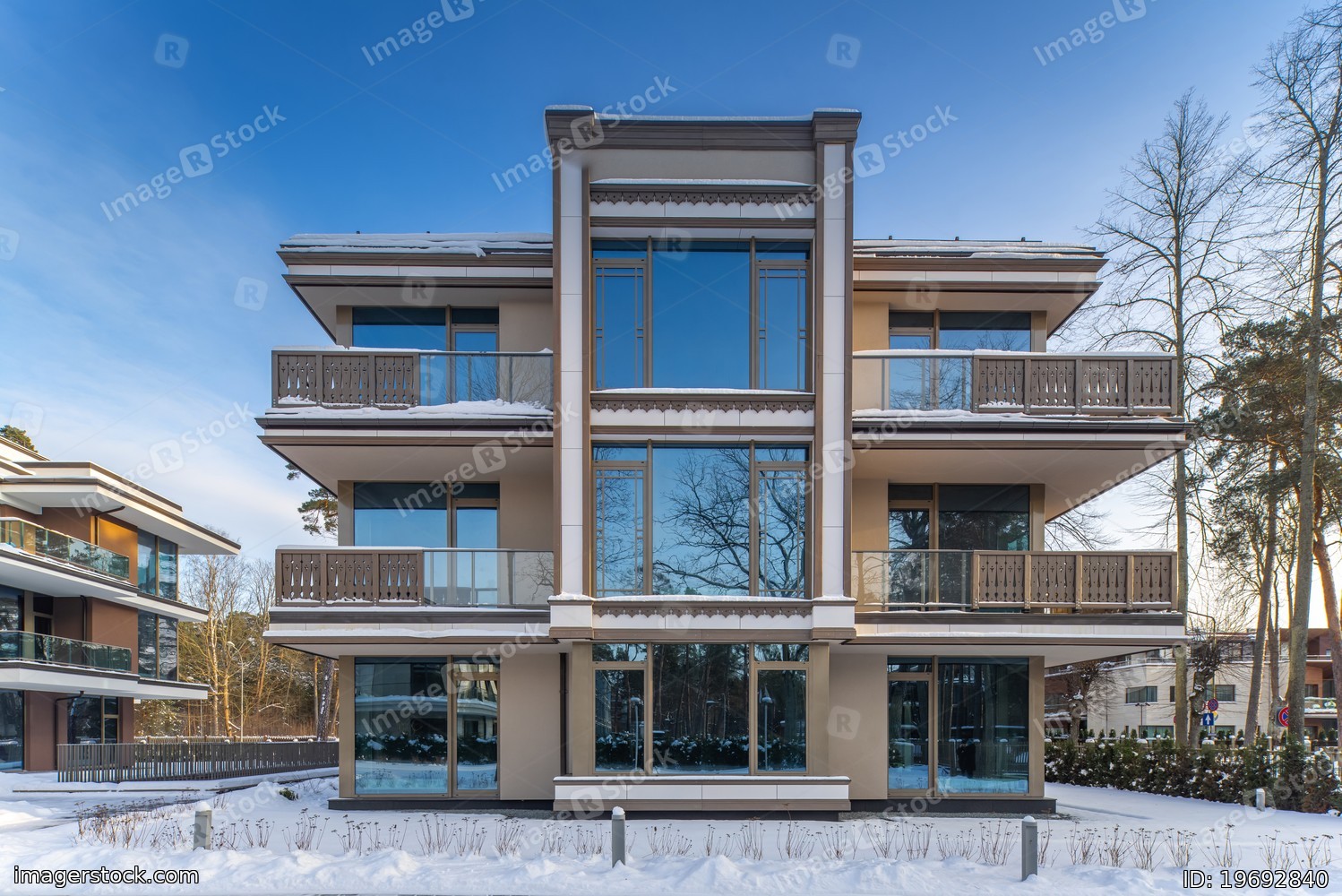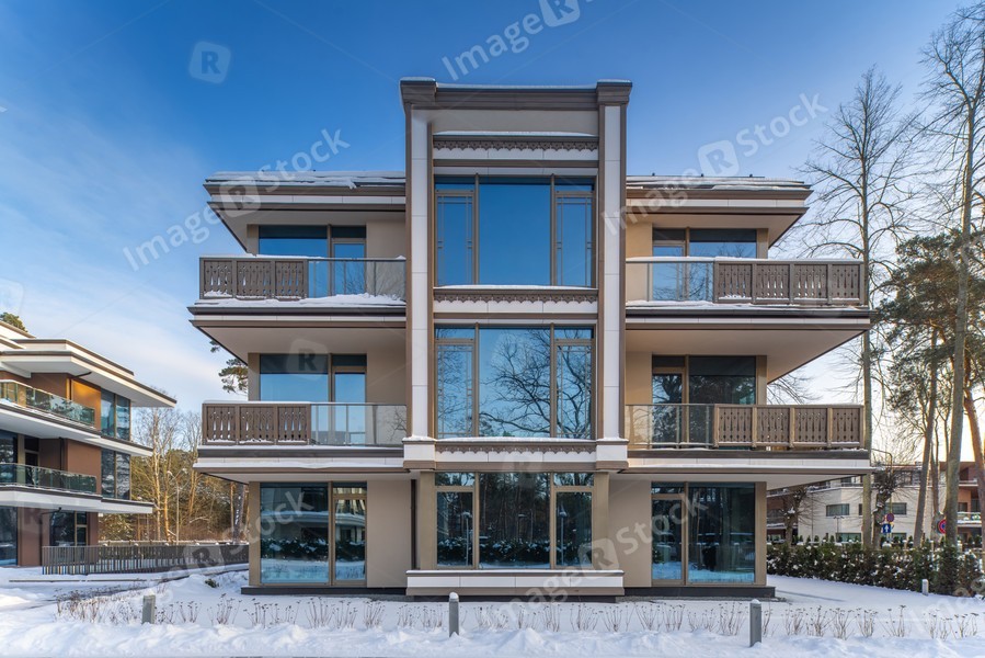 Modern exterior of new luxury residential building at winter.