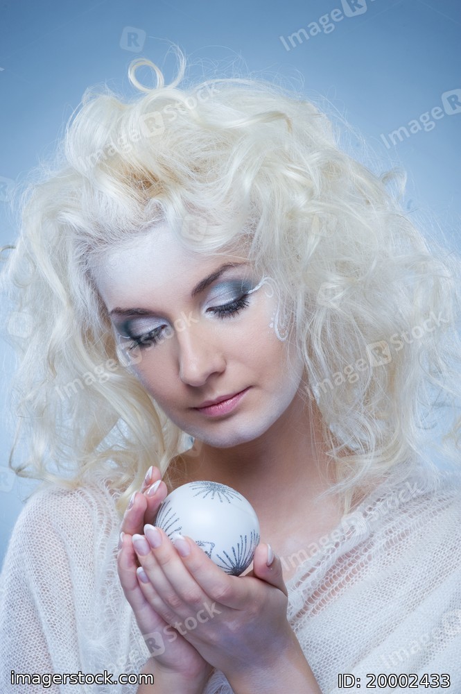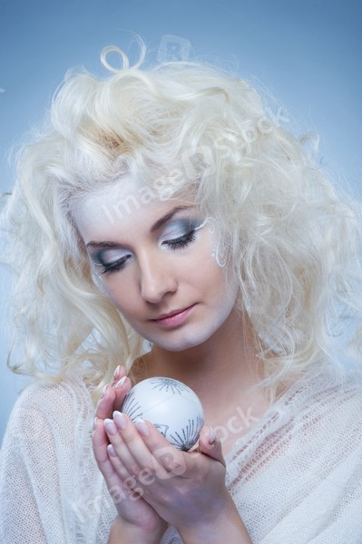 Beautiful snow queen with a christmas ball