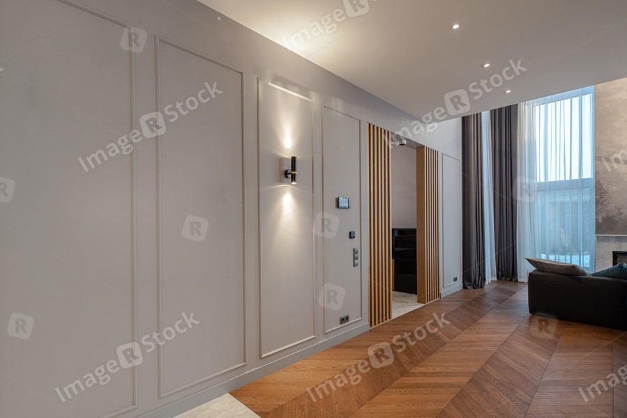 Modern wooden interior. Hardwood floor. White wall. Huge window.