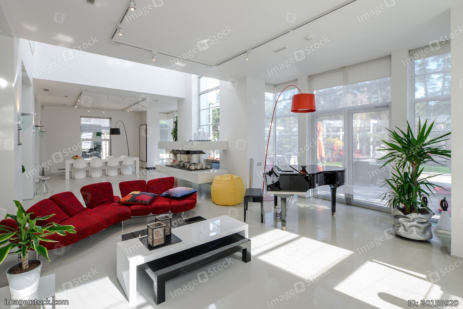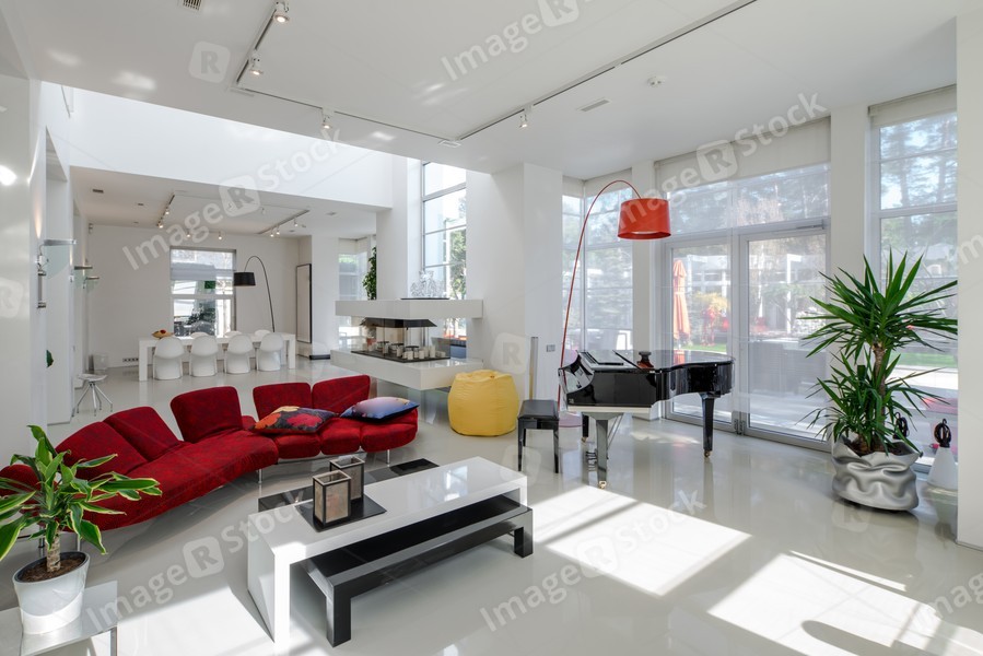 Modern interior. Luxury private house. Living room. Red sofa, piano