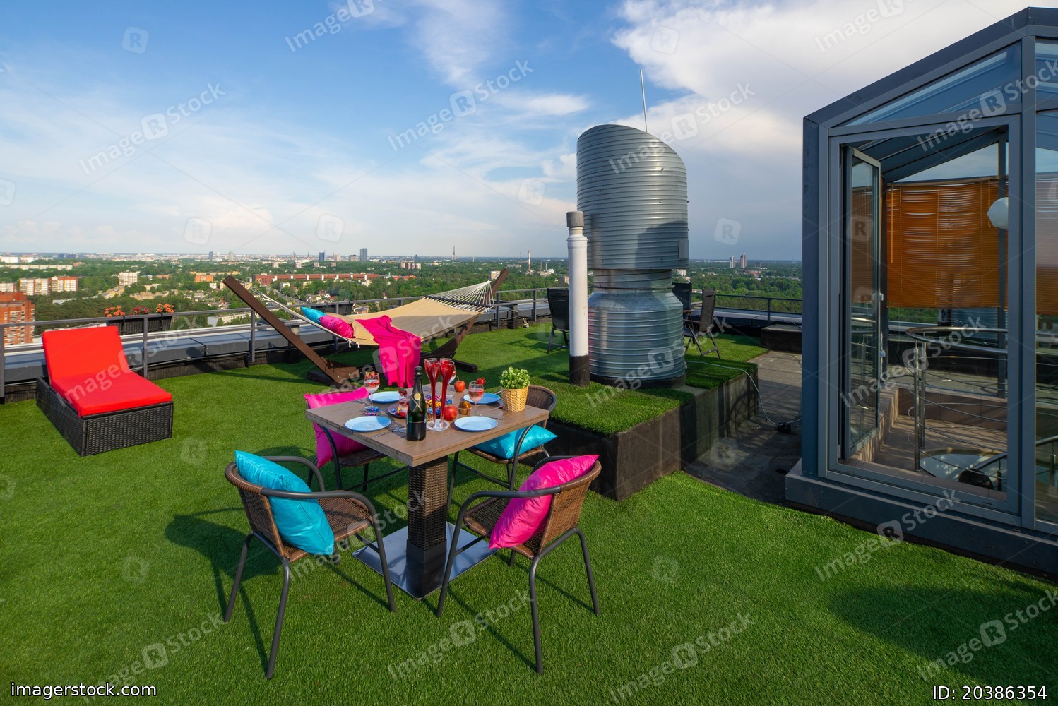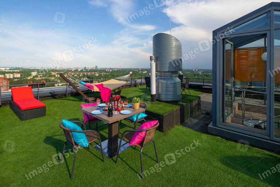 Relax zone with green grass on the rooftop. Sunny summer day.