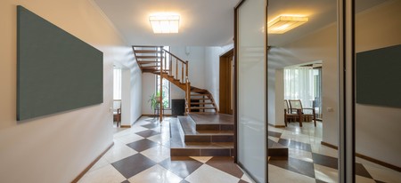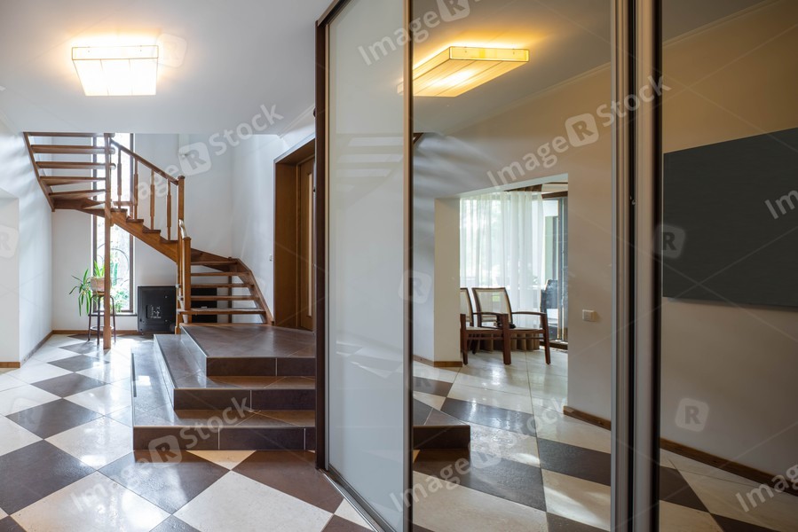 Contemporary interior of entrance hall in modern apartment. Wardrobe with mirror. Wooden staircase. Green plant.
