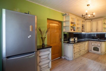 Modern interior of private country house. White kitchen set with black counter. Fridge.