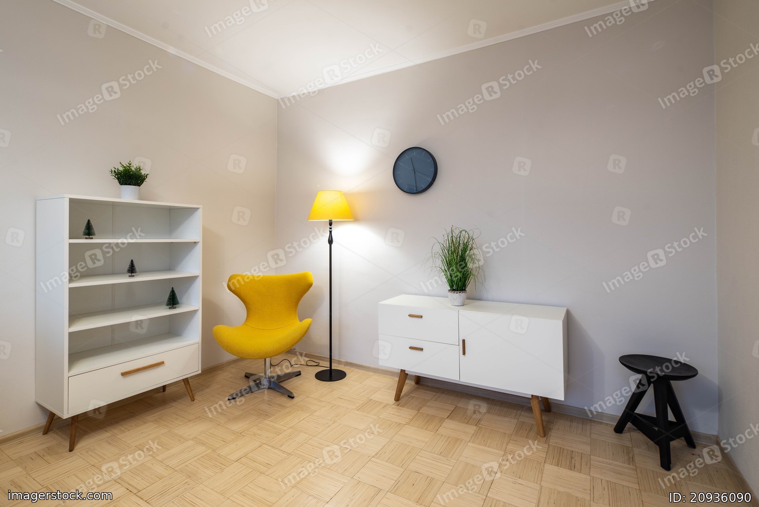 Contemporary interior of modern living room in new apartment. White walls. Yellow chair. Green plants.