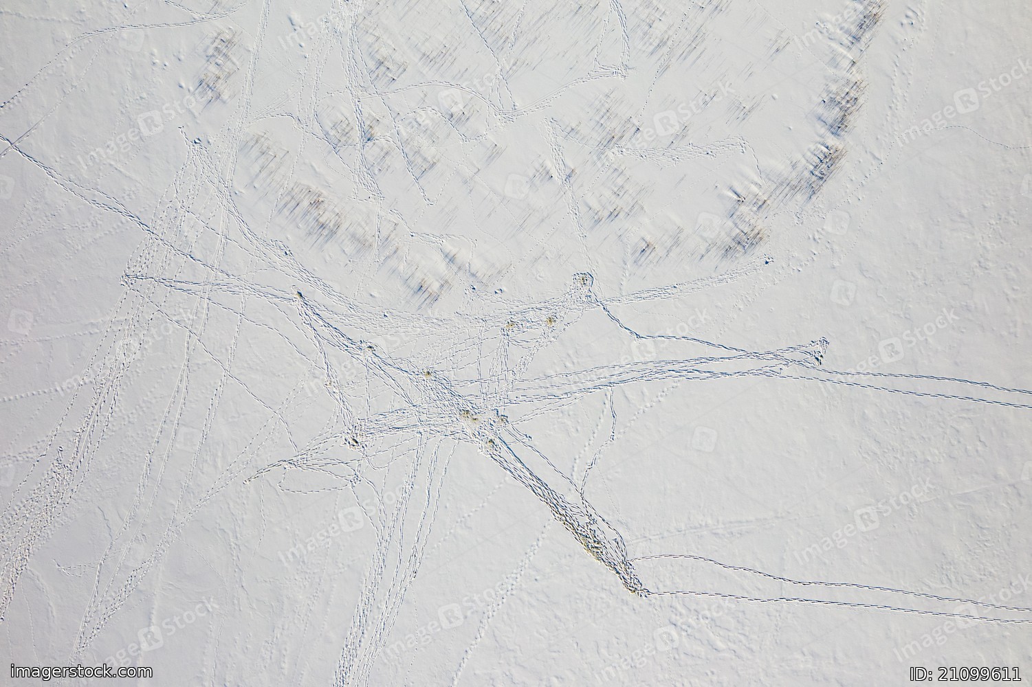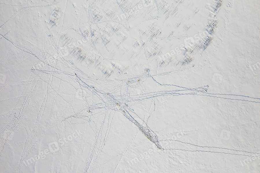 View from above of footprints and blue shadows on white snow