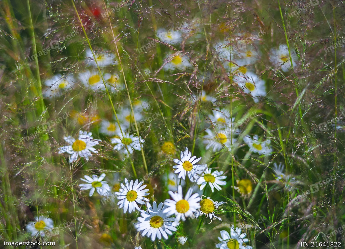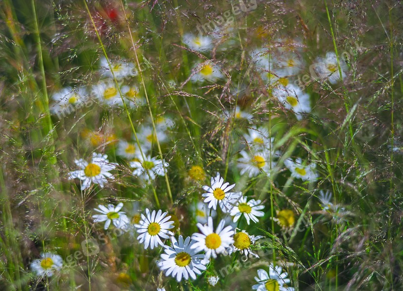 Wild chamomiles in a summer field. Different herbs,