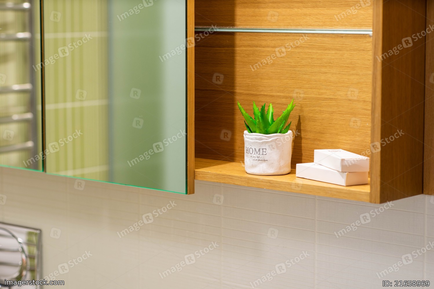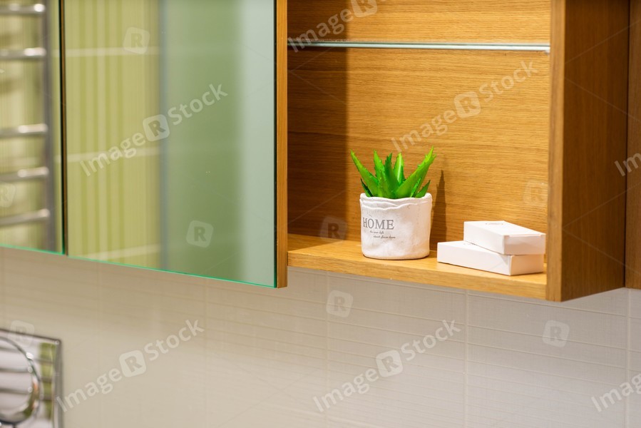 Shelf and mirror in bathroom. Decorative flower and soap.