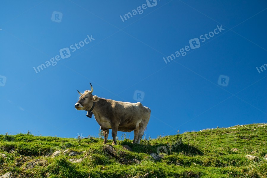 The pasture in the mountains. Cows grazing on the hills. Italy.