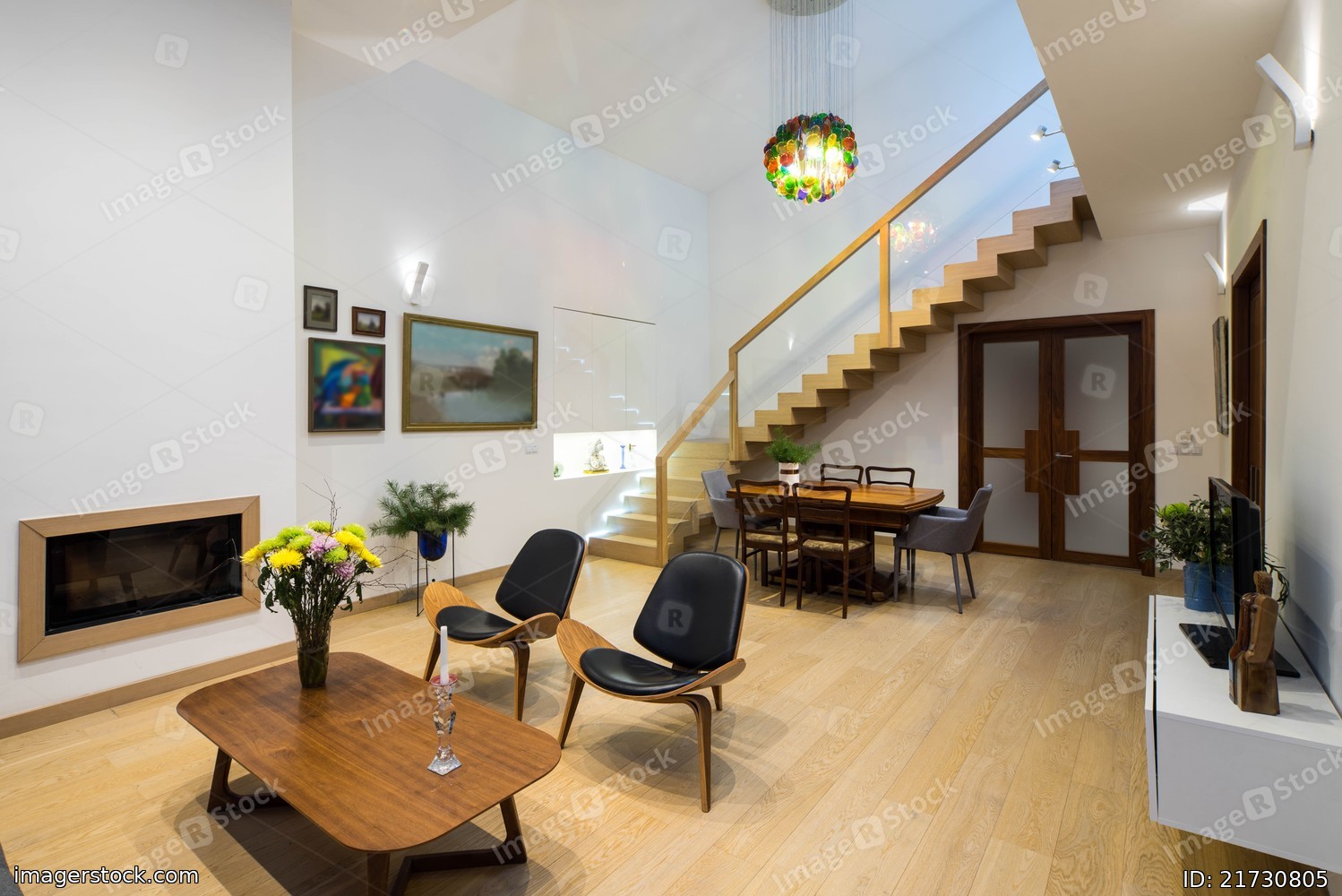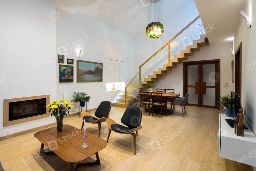 Light interior of room in private house. Entrance door. Staircase. Fireplace. Tables and chairs.