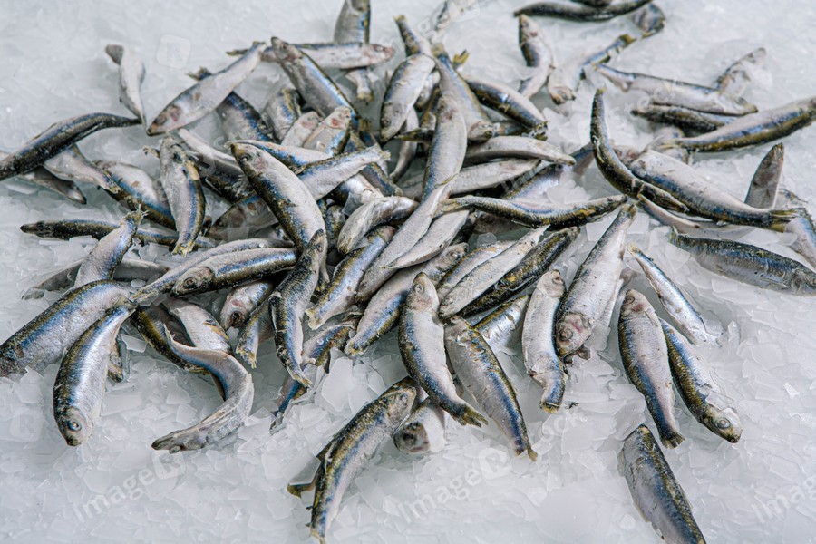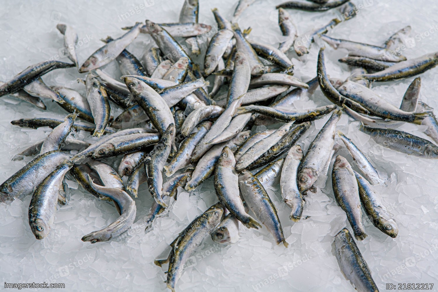 Close-up of fresh sprat on the ice in fish market. Winter fishing. Small silver fish production.