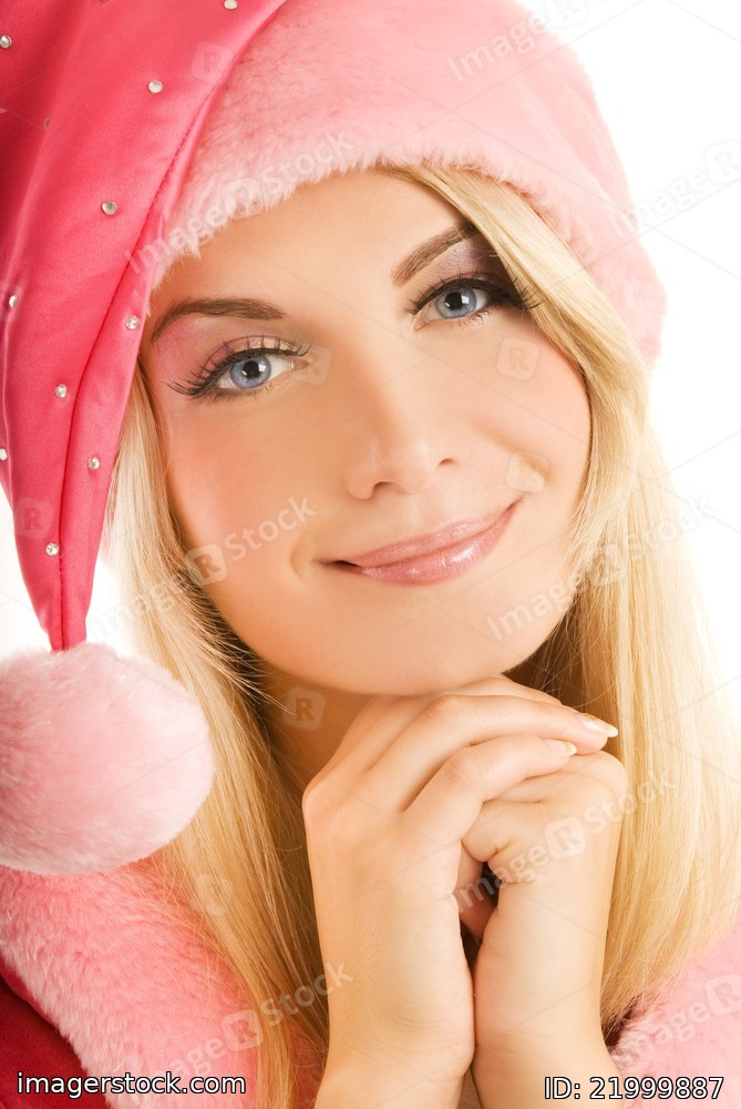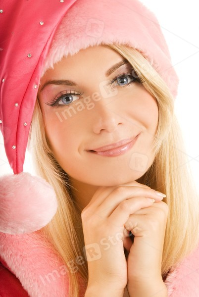 Beautiful mrs. Santa close-up portrat. Isolated on white.