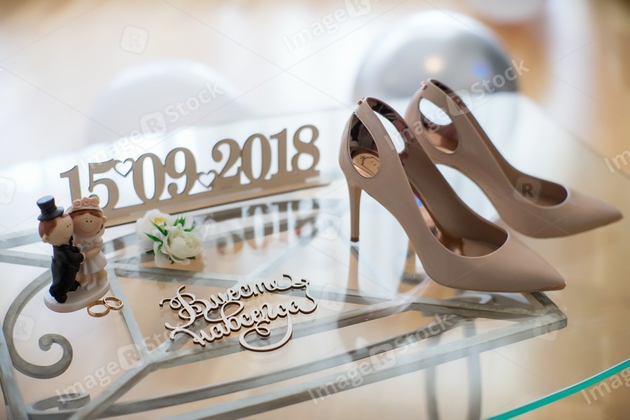 Wedding composition on a glass table. Shoes. Rings. Wedding date.
