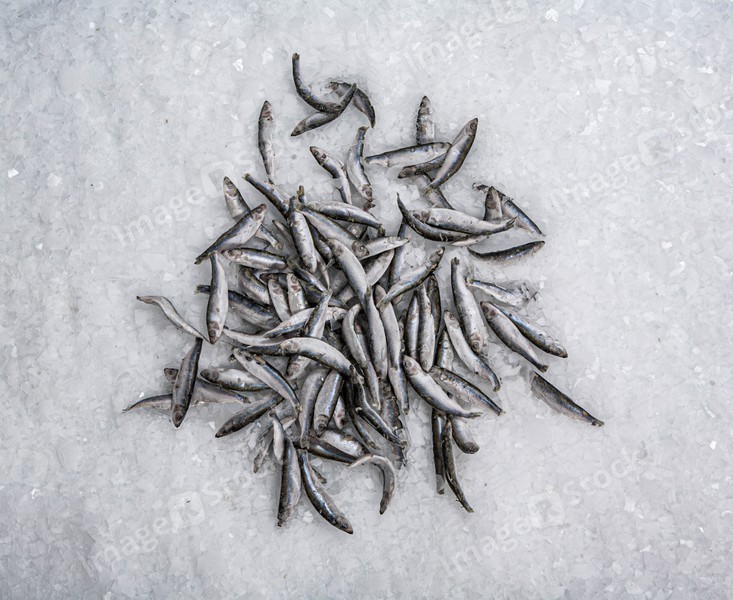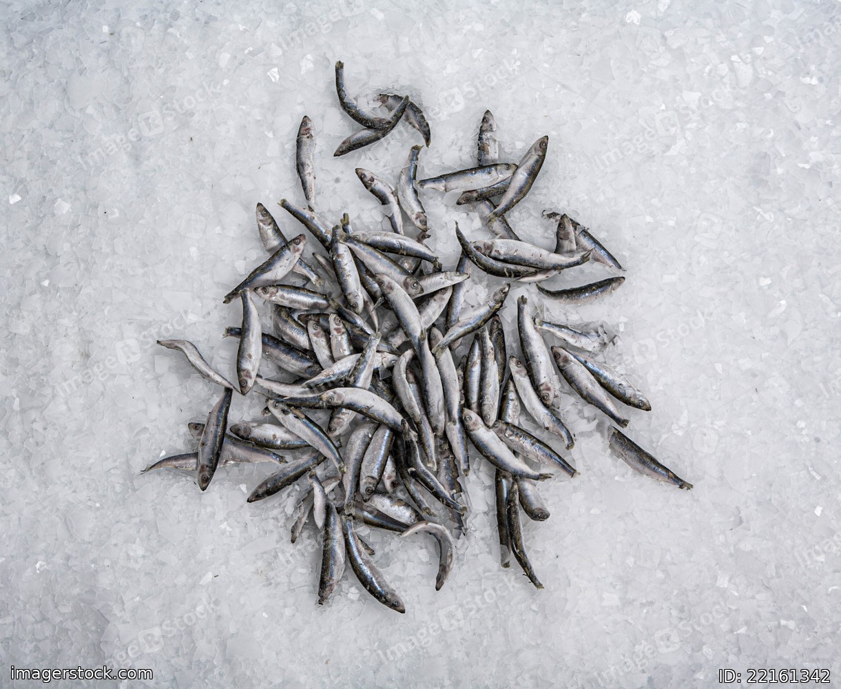 Close-up of fresh sprat on the ice in fish market. Winter fishing. Small silver fish production.