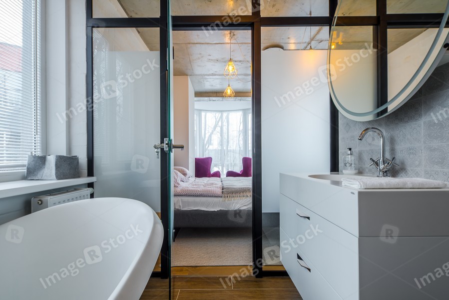 Interior of a bathroom in a modern apartment. Concrete ceilings.